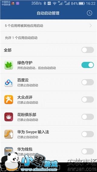 六、打开手机管家,进入权限管理,点自动启动管理,将绿色守护设为开机自启。