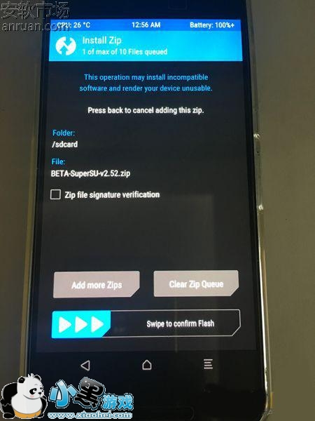 第二步,我们要把supersu卡刷文件传入电脑,然后刷入。将下载好的这个文件通过电脑放到手机内置存储的根目录下面,然后在twrp的主界面下选择install,进入之后选择刚才我们放入的supersu文件,最后将最下方的三角箭头滑条向右拉,进行刷入。
