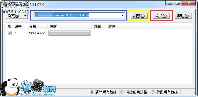 点击黄色圈选部分刷新,刷机程序会自动识别手机,点击红色圈选部分刷机开始刷机。
