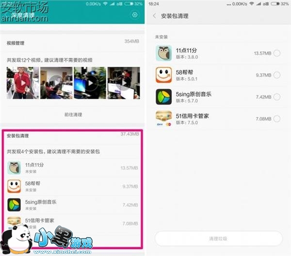 还有一种最容易被忽视的文件——APK安装包,安装包是属于那种“随用随弃的一次性消费品”,安装过后就没必要留下了。新增的“安装包清理”功能就此诞生,MIUI 将手机上的安装包文件及其占用空间列出,大家可以点击“前往清理”来到安装包清理页,然后点选不需要的安装包进行清理。