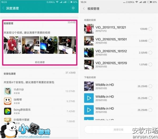 手机总会出现莫名其妙的视频文件,可能来自随手拍摄,也可能来自网上下载,但真正值得长久珍藏的视频可能并不多,大部分都是看过一遍就放在那里,时间一长这些无用视频积少成多,占用了大量的存储空间。MIUI深度清理会将手机上的所有视频文件及其大小展示出来,点击“前往清理”可进入视频管理。