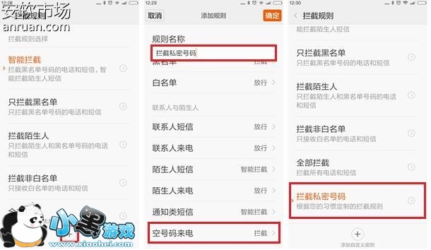 在一位官方MIUI开发人员的指导下,才终于摆脱了困扰。原来MIUI系统是可以对这种私密电话进行拦截的,还是在刚才的“安全中心”中开启骚扰拦截功能,然后点击进入“拦截规则”,再点最下方的“+”号添加一条自定义规则,规则名称可以设为“拦截私密号码”或其他类似名字,然后将“空号码来电”设为”拦截 “状态,最后点右上角的“确认”,保存并设置该规则,从此再也不用担心私密号码的频繁骚扰啦。