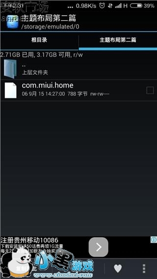 点击右边存储,找到存放 “com.miui.home”文件的文件夹(在根目录新建一个文件夹专门来存放文件比较容易找),点击选中,点击左下角复制,复制成功;