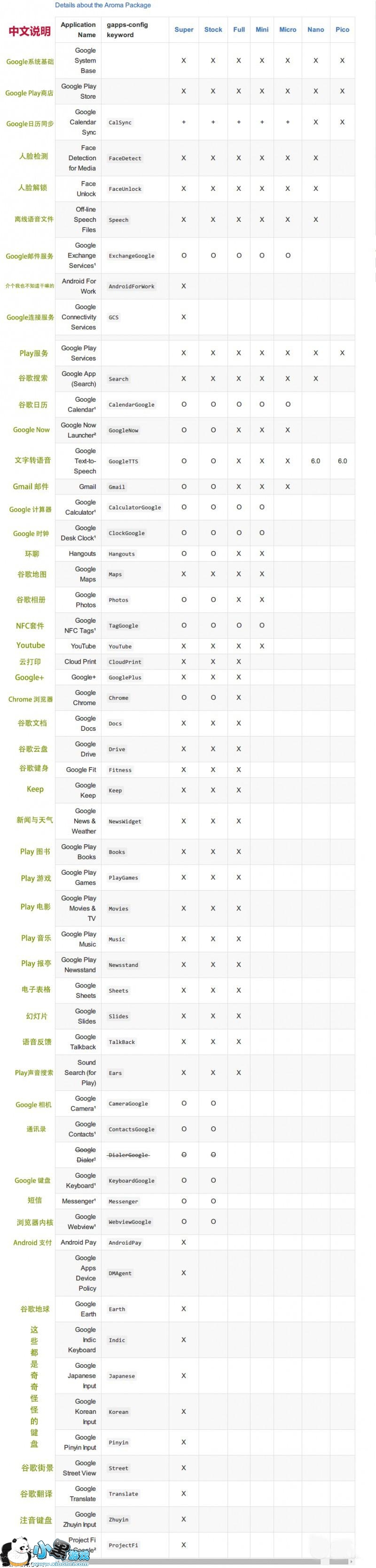 3、简单的说下谷歌服务在不同的Variant安装的应用有哪些不同(X说明的被安装,带O说明的替代掉 Aosp 应用并安装,6.0说明只有 6.0 以上会被安装)