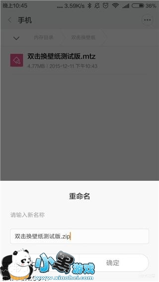 下载双击换壁纸测试版主题文件(为了方便新建文件夹操作);长按主题文件,重命名后缀为.zip,得到 双击换壁纸测试版.zip,点击解压到当前文件夹。主题格式为xxx.mtz,重命名为xxx.zip后当可解压。