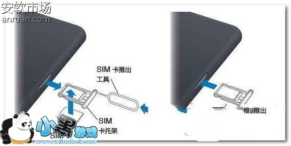 装SIM卡步骤十分简单,主要为使用卡针,插入到机身顶部SIM卡附近的小孔,然后稍微用力一顶即可弹出SM卡槽,我们将手机SIM卡放入卡槽,然后再装入手机即可,具体操作如下示意图: