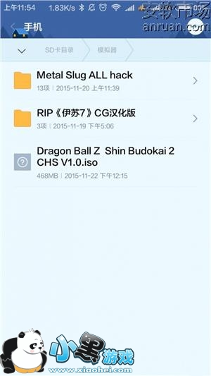 我在SD卡新建了一个文件夹,用来专门存放模拟器游戏的,名字就叫做模拟器,我这里下载的游戏有三个,有龙珠2,合金弹头和伊苏7,当然大家也可自行搜索下载自己喜欢的游戏。进入模拟器~