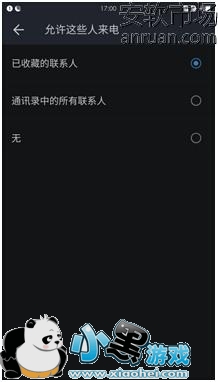 2.允许来电设置可以设定“已收藏的联系人”、“通讯录中的所有联系人”或者“无”。有些用户有拒接所有陌生电话的需求,就可以使用第二项设定;如果在度假、开会的情况,需要完全勿扰,就可以勾选“无”。