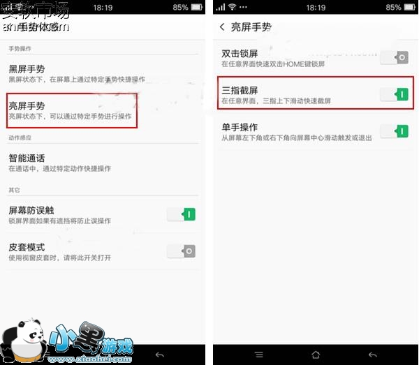 1、首先需要进入OPPO A53手机的【设置】-【手势体感】-【亮屏手势】设置,然后开启【三指截屏】功能,如图。