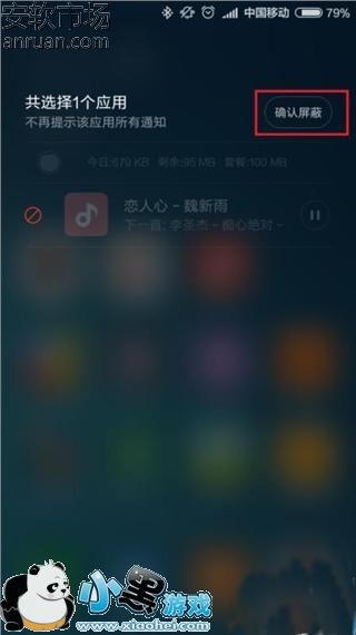 5、接下来,在页面右上方弹出的“确认屏蔽”按钮中,点击选择该按钮,然后我们就可以确定屏蔽了小米音乐的通知栏控制开关了,同时我们也可以看到应用被屏蔽的记录提示。