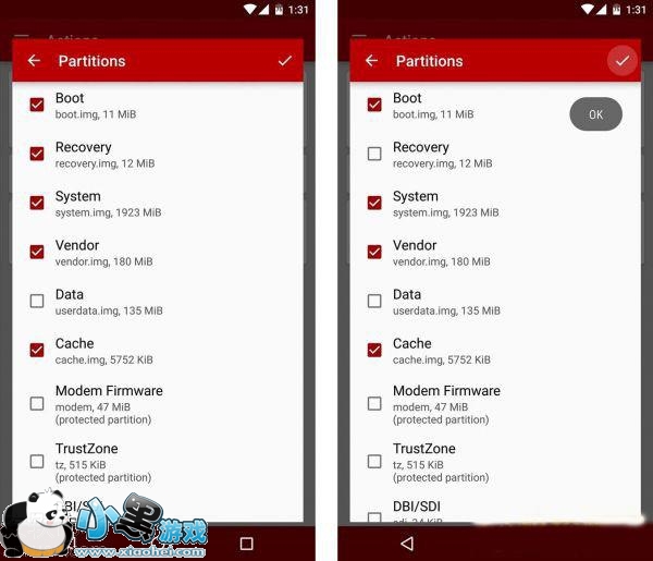 系统包分析完后,会弹出菜单,默认勾选了Boot,Recovery,System,Vendor,Cache,你也可以不勾选Recovery,这样就可以保留你之前刷入的第三方Recovery,建议用默认勾选的模块,(至少要勾选Boot,System,Vender,因为这是安卓系统更新的核心模块,其他的,高级玩家自己可以随意)。勾选完成后,点击右上角的“勾”