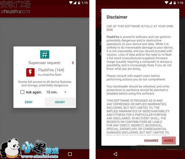 打开了FlashFire后,会看到超级用户权限授权和软件声明协议,这里同意授权和声明协议。