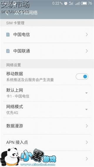 数据选择卡1,至此电信卡上网正常,移动/联通接打电话正常。
