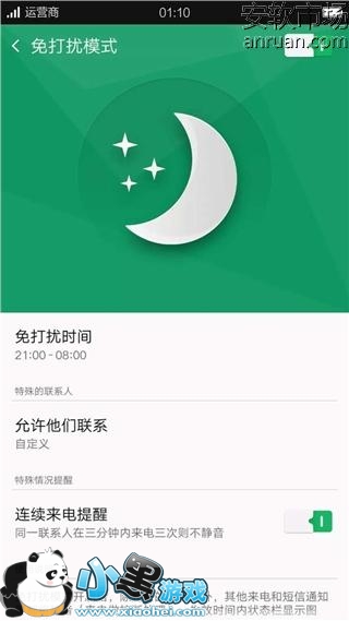虽说在免打扰期间想拥有足够的私人空间,但如果对方真有急事找你怎么办?所以你只要打开了这个选项,同一联系人在三分钟内来电三次则不再静音。