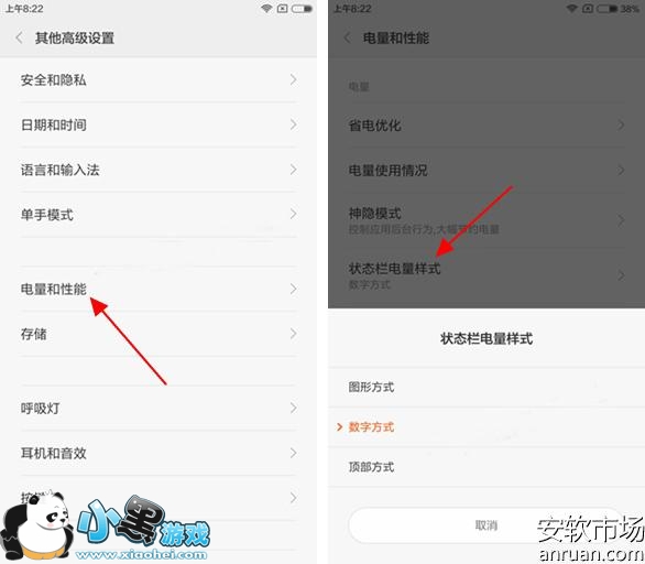 2、然后,选择【电量和性能】找到【状态栏电量样式】,选择数字方式: