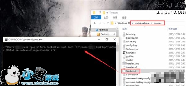 按照上文中第一步的步骤打开CMD,在命令行输入“fastboot boot C:/(你存放Android线刷包的路径)/Native-release/images/loader.efi”,然后敲回车,设备会出现米兔的fastboot界面。