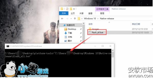 将Android线刷包里面的flash_all.bat文件拖入命令行中,敲回车,等待刷机完成。