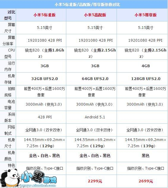 小米5全部版本详细参数对比 1、首先,按照国际惯例我们来看看小米5标准版、高配版、尊享版硬件详细参数对比: