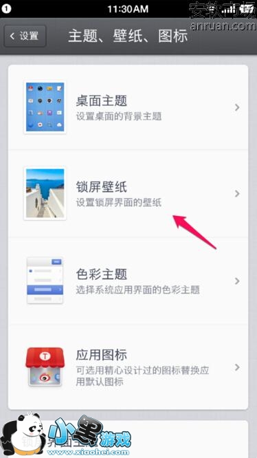 3、进入以后,可以看到当前锤子手机的桌面主题,也可以设置锁屏界面的壁纸,点击锁屏壁纸这个功能进入,如下图。