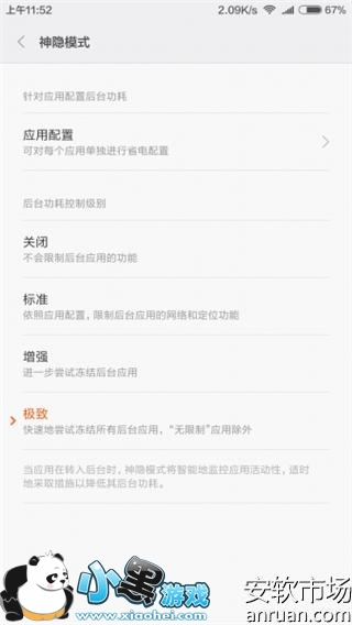 从3.23开发内测版开始,米5也开始支持更高阶的神隐模式,就是第三种极致模式。有的人急忙打开自己的神隐模式,等等先别着急,极致模式和开发者选项一样,需要小技巧才能打开。需要连续点击神隐模式中的第二项增强模式,这下你就可以看到极致模式了,想关掉也是连续点击增强模式。喂,别走还没完。如果没有出现极致模式,可能是你版本太低,稳定版还不知道有没有,开发版最新3.25应该也是支持的,我从内测更新到开发这个模式还在。