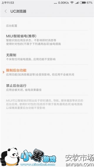 接下来的是对于经常使用但又不需要推送通知的应用,例如UC,浏览器,输入法之类的就选择限制后台功能。我来说下为什么这类应用不需要推送还要留后台。其实安卓和苹果一样,内存是用的越多越流畅,原理就是让应用留在内存,下次打开会非常快而不需重新从闪存载入,UC就是常用应用,但是我们并不需要它给我们推送广告,输入法也是一样。可以让他们在后台,但决不允许他们在后台搞小动作,这就需要限制后台功能。从而不影响使用,又不会让他们占着后台耗资源。