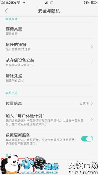 2然后我们打开【安全与隐私】,往下啦,就好看到 高级【固定屏幕显示】