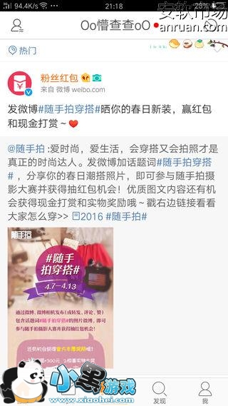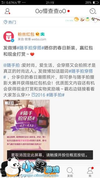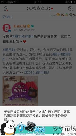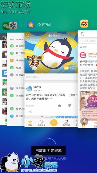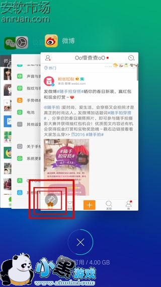 4下面我们以微博为例看看如何操作这个功能,首先我们打开了该应用,然后点击左边的多任务键,这个时候我们就发现比较木有开启【固定屏幕显示】功能前的 多任务界面,应用预览图的 左下角多了一个类似图钉一样的按钮,只需要点击这个按钮,我们就可以固定显示这个应用了!