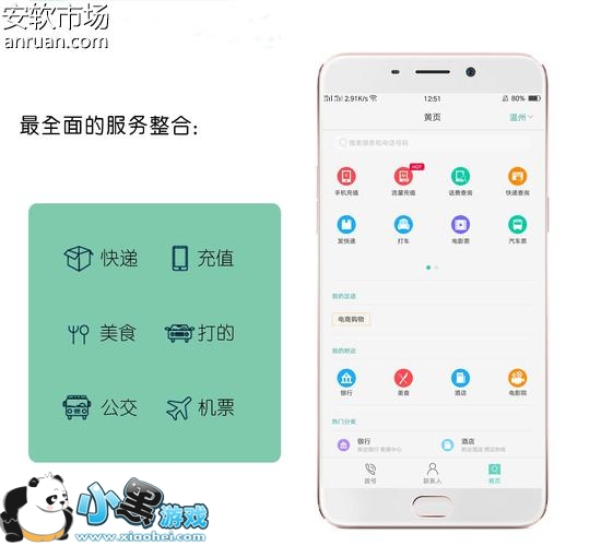 聚合快递、美食、出行、手机充值等多方面服务整合。将一些实用而可能不常用的功能全部整合至「黄页」中,也免去了安装一些额外APP的苦恼。进入「电话本」或「联系人」后选择右下角「黄页」即可进入。