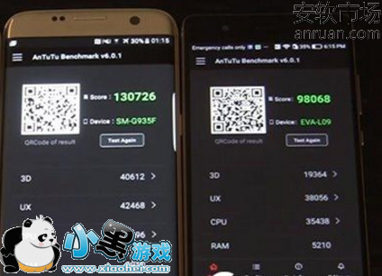 2、从海思麒麟930和950的跑分差距我们可以看出这次华为P9在CPU上有重大的进步,跑分如图(从左到右依次为:华为p8,三星s7,华为p9)