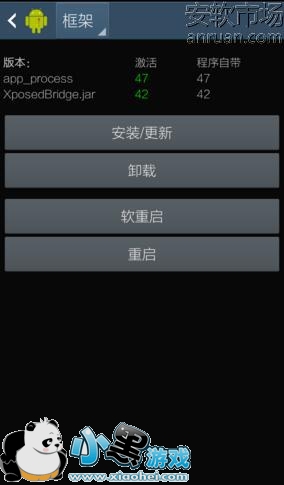 3、先安装Xposed管理器,安装好后,打开,进入设置,将“禁用资源钩子”打勾然后再回到这个软件,安装框架,等待5~10秒,手机会软重启,此时会卡第二屏!等待2分钟左右,直接长按电源键重启手机!此次重启后,会在第二屏再卡1~3分钟,然后进入系统,开始优化应用,等待全部优化完毕,Xposed模块安装完毕,成功以后,Xposed框架一般显示如图: