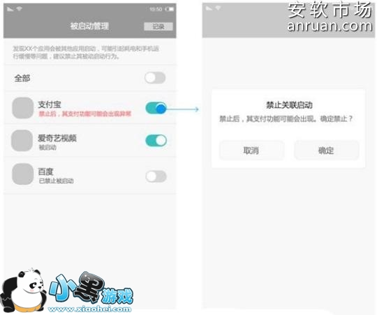 管理关联启动,在上右图点击上端被其他应用启动,进入【被启动管理】,就可以管理被启动软件,建议开启支付宝,否则淘宝购物无法启动支付宝付款,如图所示: