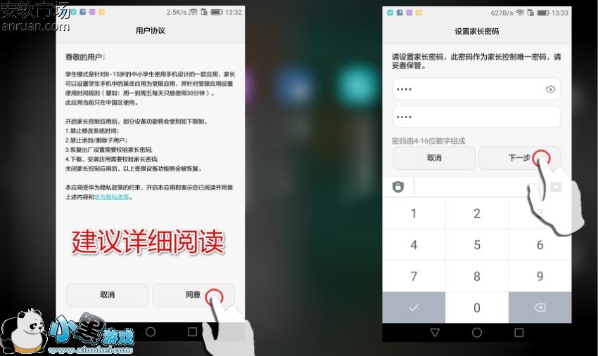看完用户协议点击“同意”然后设置家长密码,然后点击下一步