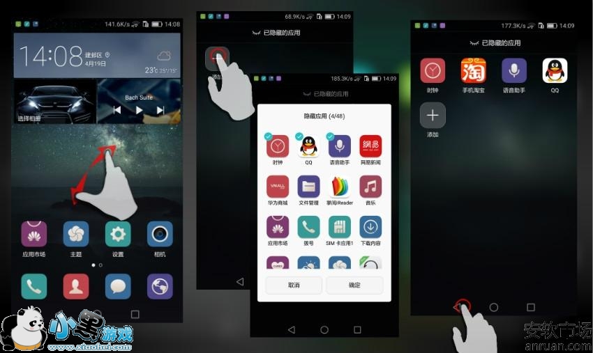 双指向外滑动进入隐藏应用界面,添加不想让孩子看到的应用,点击确定,然后点击返回键回到桌面,这样一些应用就隐藏起来了,孩子就无法查看了。