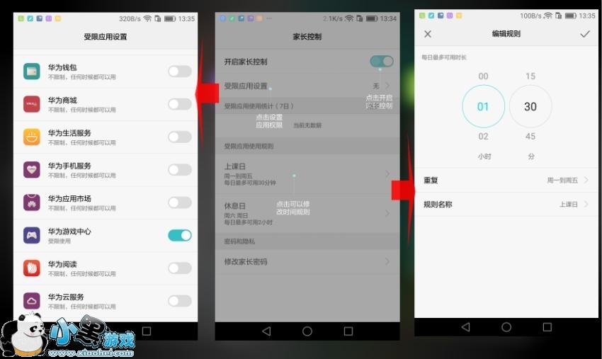 在【家长控制】界面选择开启家长控制,下面有受限应用设置:可以选择需要受到限制的应用软件,并且对不同情况设置不同是使用时间,比如设置为一个半小时,那么这些应用只能在规定时间内使用,完美的控制孩子的使用时间