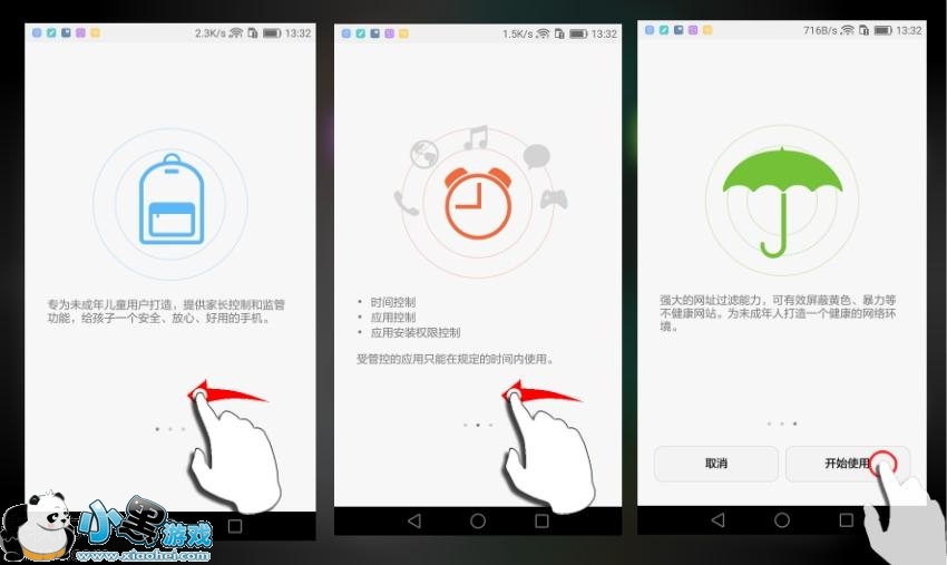 然后就进入家长控制介绍界面,你可以详细阅读上图内容,滑动到最后一页点击“开始使用”