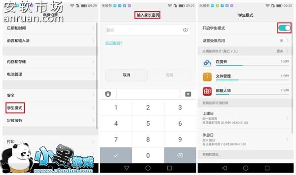 这个很适合家长对孩子玩手机的控制,目前学生玩手机越来越普遍,有些太小的小孩上网会看到一些不好的内容或者不好的游戏,所以这个学生模式很重要。可以将一些网页添加黑名单,一些软件的下载与使用需要密码才可以。具体设置步骤:先进入【高级设置】界面,选择【学生模式】选项,填入家长密码,然后开启【学生模式】即可,具体的一些设置可以在界面自行设置。