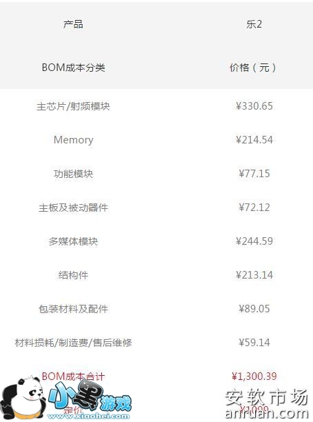 2、下面我们来看下官网给出的乐2手机的原器件价格与售价对比: