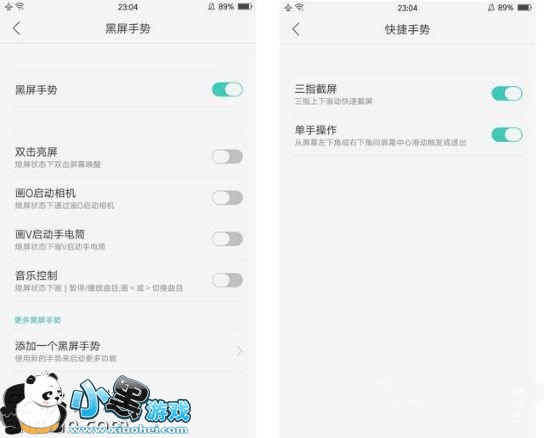 开启黑屏手势模式以后可以直接在黑屏熄屏状态下,直接进入相机、电筒等应用,中间跳过了手机解锁、点击APP这两步,当然还有快捷手势如三指截屏、单手操作,开启方式如图所示: