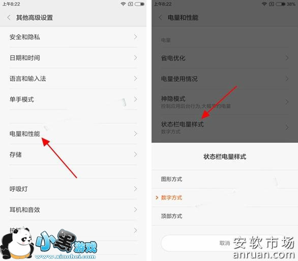 二、然后在小米Max的“其他高级设置”设置中,我们再点击进入【电量和性能】设置,之后找到并点击【状态栏电量样式】,选择【数字方式】之后,我们就会发现此时红米Note3电池电量以百分比的形式显示了,如下截面图所示