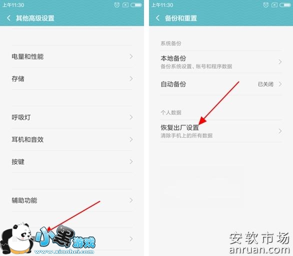 2、进入其他高级设置界面后,再进入【备份和恢复】设置,之后进入【恢复出厂设置】,如下图所示。