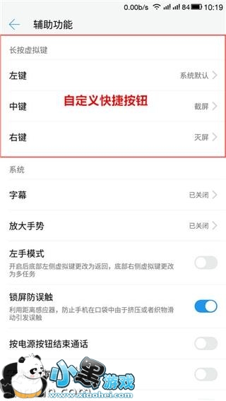 如下图:打开设置→辅助功能→长按虚拟键,在这里你可以根据自己使用习惯来设置左键、中键、右键为快捷截屏键(这里我设置的是中键哦)。