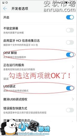手机进入设置——打开关于手机——连续点击版本号,开启开发者选项。进入开发者选项,勾选OEM解锁,勾选USB调试。然后用USB线连接到你的电脑。
