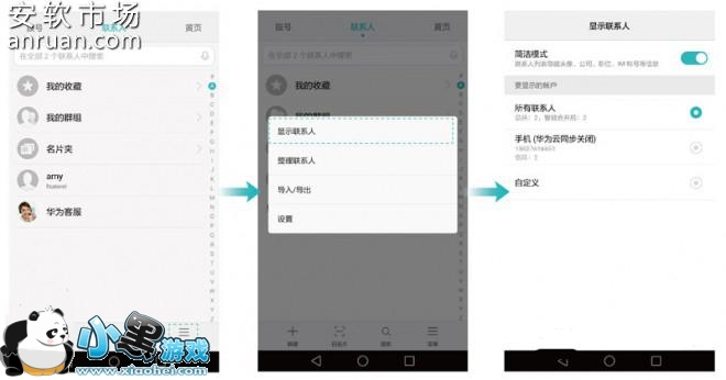 在联系人中,点击【菜单】>【显示联系人】,你可以根据您对联系人信息来源的需求,选择需要显示的账户,轻松实现定制显示某一批联系人而隐藏其余的联系人。