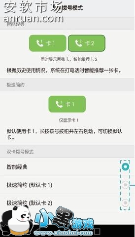 点击【双卡拨号模式】,可设置拨打电话时显示两张 SIM 卡或仅显示一张默认 SIM 卡。如果设定了默认卡,手机将优先使用默认卡拨打电话。