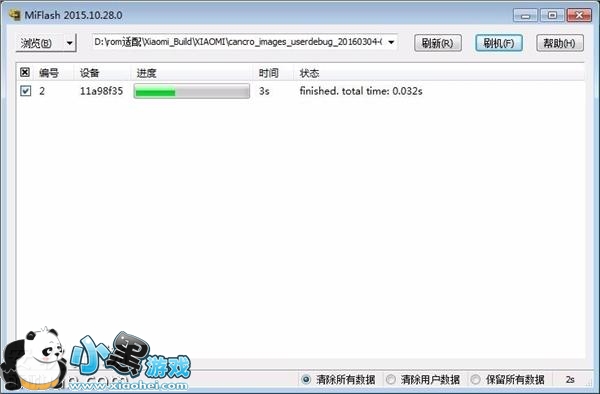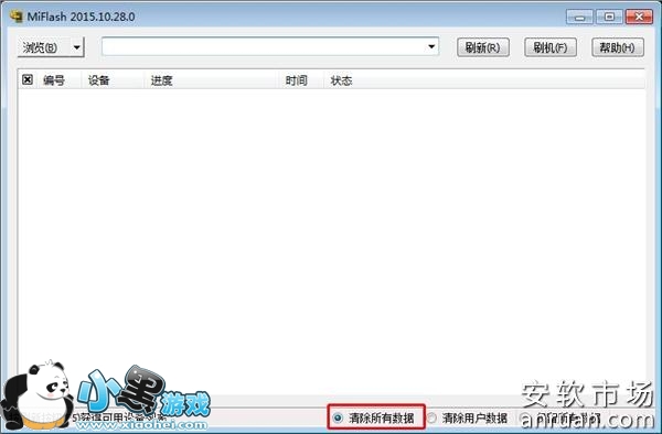 在手机关机状态下长按“音量下+电源键”,进入 fastboot 模式;将手机与电脑通过 USB 线相连;在电脑上打开 miflash,选中“清除所有数据”;