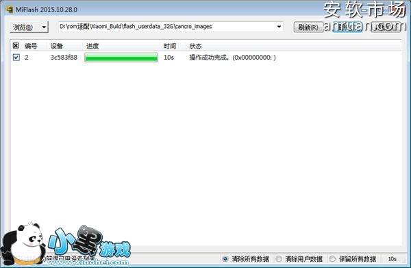 首先下载小米3/小米4内存修复包(32GB修复包/64GB修复包)关机状态下长按“音量下+电源键”,进入 fastboot 模式;将手机与电脑通过 USB 线相连;在电脑上打开 miflash,选中“清除所有数据”;