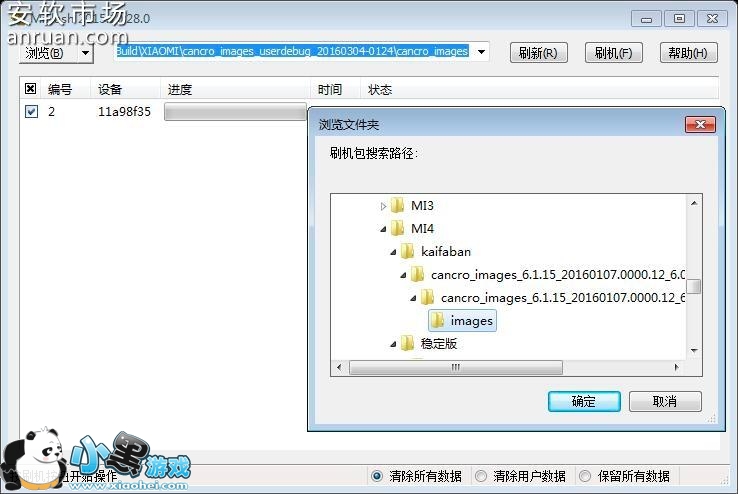”点击“浏览”按钮,在弹出的“浏览文件夹”窗口中,选择对应的线刷包,点击“确定”;