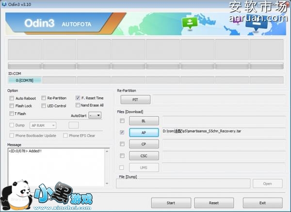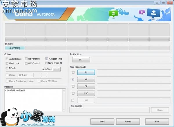 关机状态下同时按手机的“音量下”键、“Home”键和电源键,在警告界面按“音量上”键选择继续,进入“挖煤模式”;在电脑上打开“Odin3”后,通过 USB 线将手机与电脑连接,方框中位置显示为蓝色时,表明连接成功;