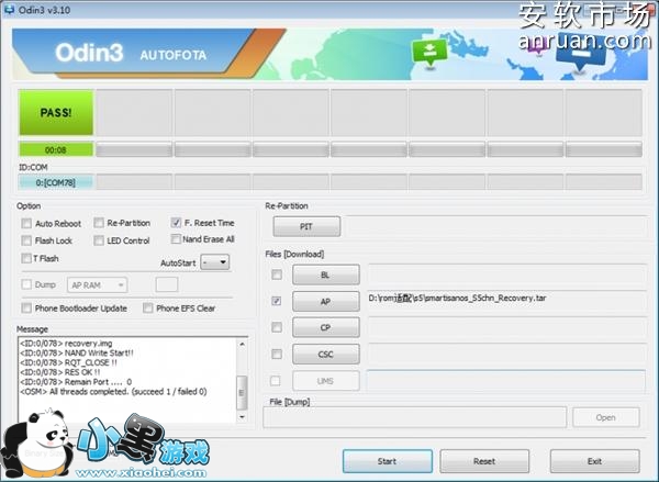 在“Odin3”中点击“Start”按钮,刷入recovery。