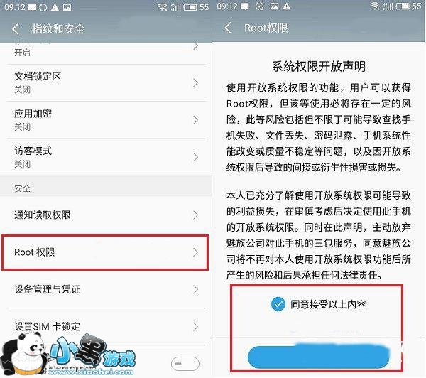 四、在登录Flyme账号的情况下,在指纹和安全设置底部,就可以找到 ROOT 选项了,点击「root权限」,并在接下来的提示界面中,勾选上「同意接受以上内容」,并点击下方的「确定」,如图所示。
